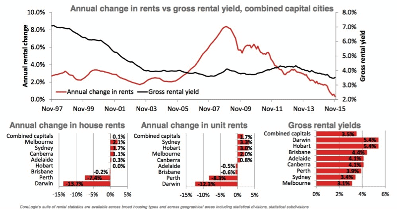 Over the same time period rents in Adelaide, Perth and Darwin have fallen, and rents in Hobart are unchanged. (source CoreLogic)